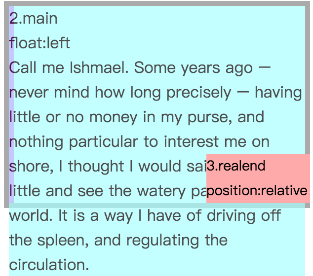 在第二节中,我们针对end元素设置了相对定位,对realend元素设置绝对定位。但是我们可以采用更为简单的代码来实现,即只使用相对定位。熟悉定位模型的同学应该知道,相对定位的元素仍然占据文本流,同时仍可针对元素设置偏移。这样,就可以去掉end元素,仅针对realend元素设置相对定位。