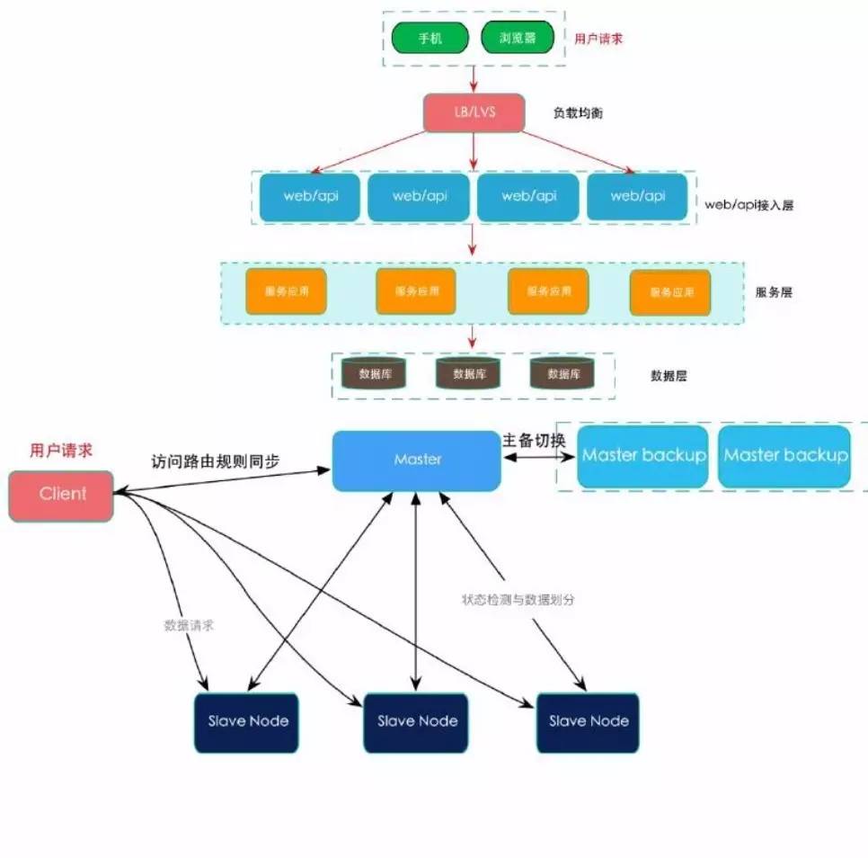 上图是典型的分布式架构。最重要的接入层和服务层要做到服务的无状态化,每个节点都需对等,因为这两层主要做读请求且请求量较大。做无状态化是便于横向扩展,当业务量大时,就可迅速部署机器来支撑流量。