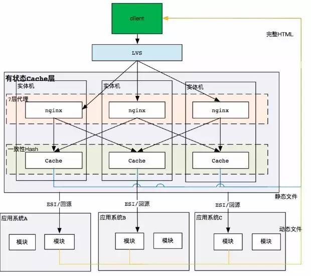 如上图,一个系统 APS 和服务层有五层代码,通过水平扩展加机器也解决不了问题。在业务层,没办法做水平扩展,必须做有状态的变化, 部署带有分组功能的一致性 Hash 的 Cache。