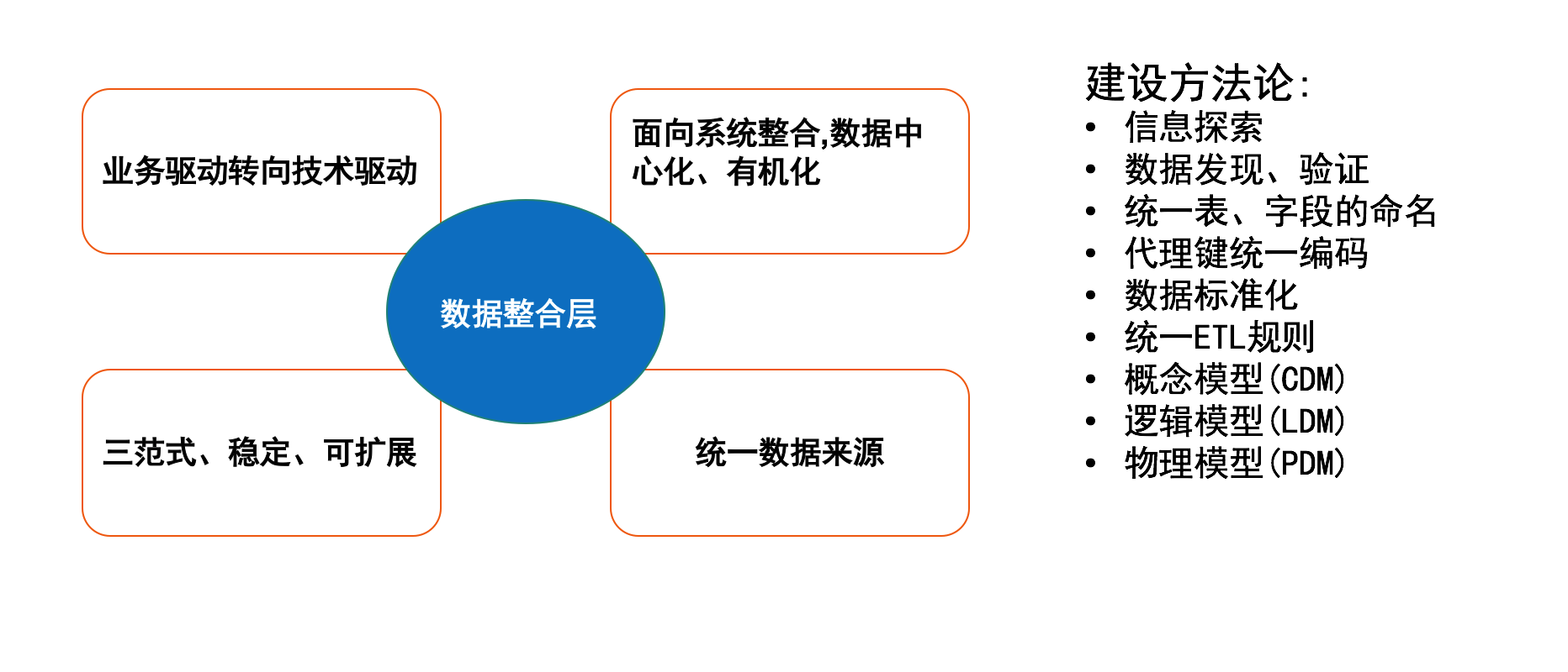于是我们在ODS与多维明细层中间加入了数据整合层,参照Bill Inmon所提出的企业信息工厂建设的模式,基本按照三范式的原则来进行数据整合,由业务驱动调整成了由技术驱动的方式来建设数据仓库基础层。下图是该层次的一些描述: