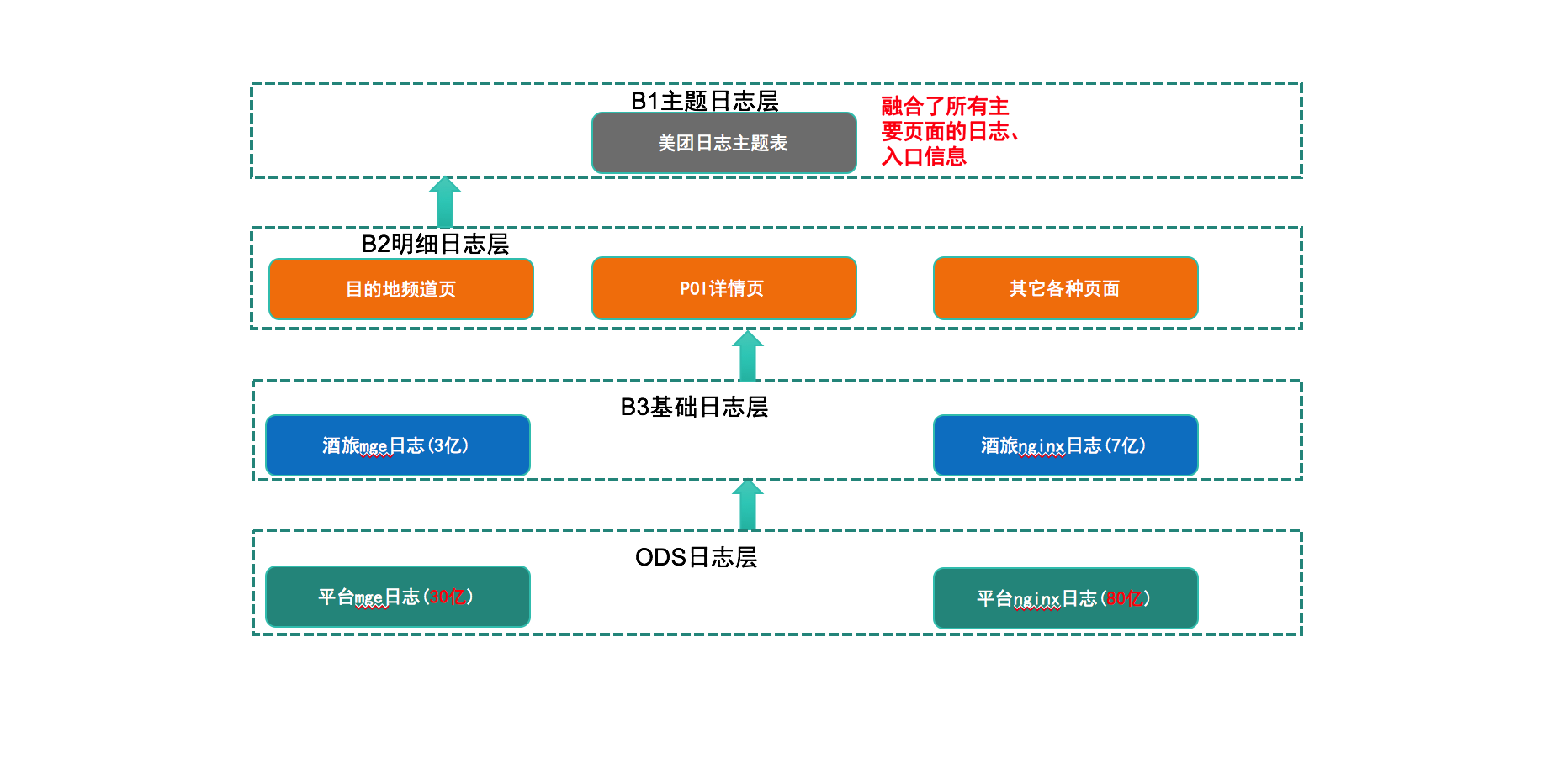 流量主题与订单主题的区别是非常大的,它的数据来源具有一定的特殊性,我们的总体建设思路是总-分-总的思路,首先从总的日志数据中剥离出来属于酒旅事业群的数据,后续再从这些数据中分拆到各个具体的页面(可以适当补充些各个页面中所具有的B端信息,如POI详情页中增加POI品类信息),最后再把各个页面进行合并生成总的日志主题表(最终这张表会满足80%以上的相关流量统计需求)。