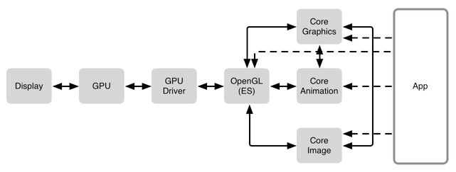 OpenGL 之上扩展出很多东西。在 iOS 上,几乎所有的东西都是通过 Core Animation 绘制出来,然而在 OS X 上,绕过 Core Animation 直接使用 Core Graphics 绘制的情况并不少见。对于一些专门的应用,尤其是游戏,程序可能直接和 OpenGL/OpenGL ES 交流。
