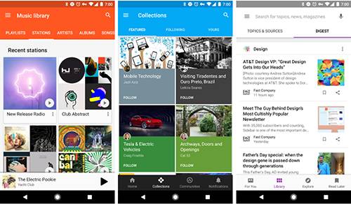 Play Newsstand(右上)使用标签来在选项卡上呈现不同的相同信息集。一个选项卡提供了一个整体,多层次的集合;而另一个则显示了一组精简的标题。
