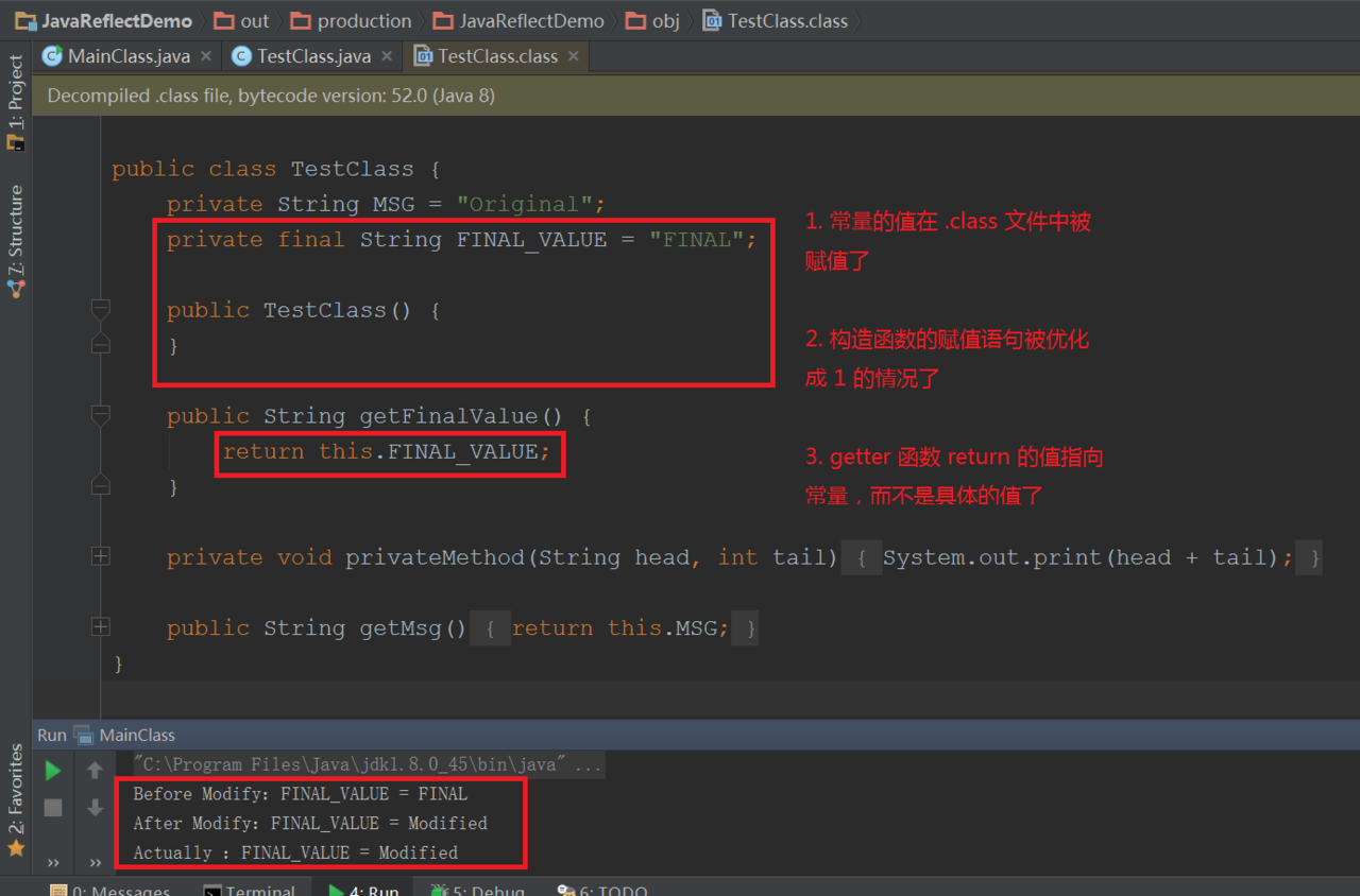 纳尼,最后一句输出修改后的值了?对,修改成功了!想知道为啥,还得看编译后的 TestClass.class 文件的贴图,图中有标注。