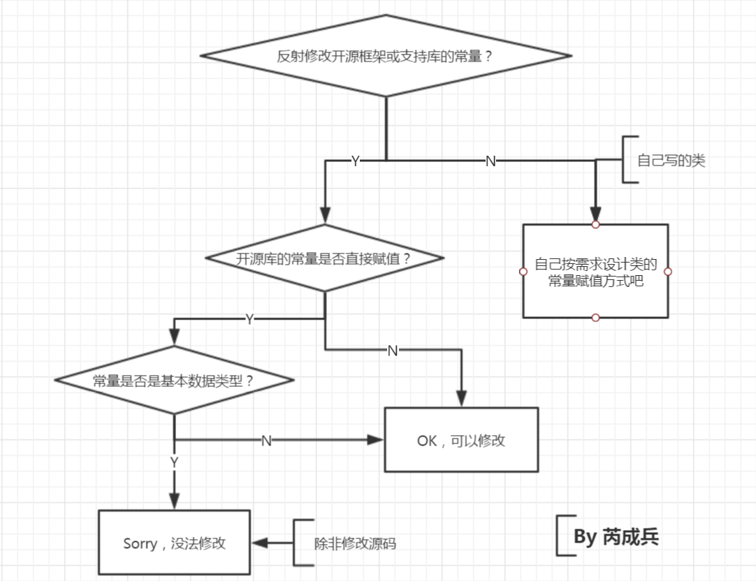 必须提醒你的是,无论 直接为常量赋值 、 通过构造函数为常量赋值 还是 使用三目运算符 ,实际上我们都能通过反射成功修改常量的值。而我在上面说的修改"成功"与否是指: 我们在程序运行阶段通过反射肯定能修改常量值,但是实际执行优化后的 .class 文件时,修改的后值真的起到作用了吗?换句话说,就是编译时是否将常量替换为具体的值了?如果替换了,再怎么修改常量的值都不会影响最终的结果了,不是吗? 。
