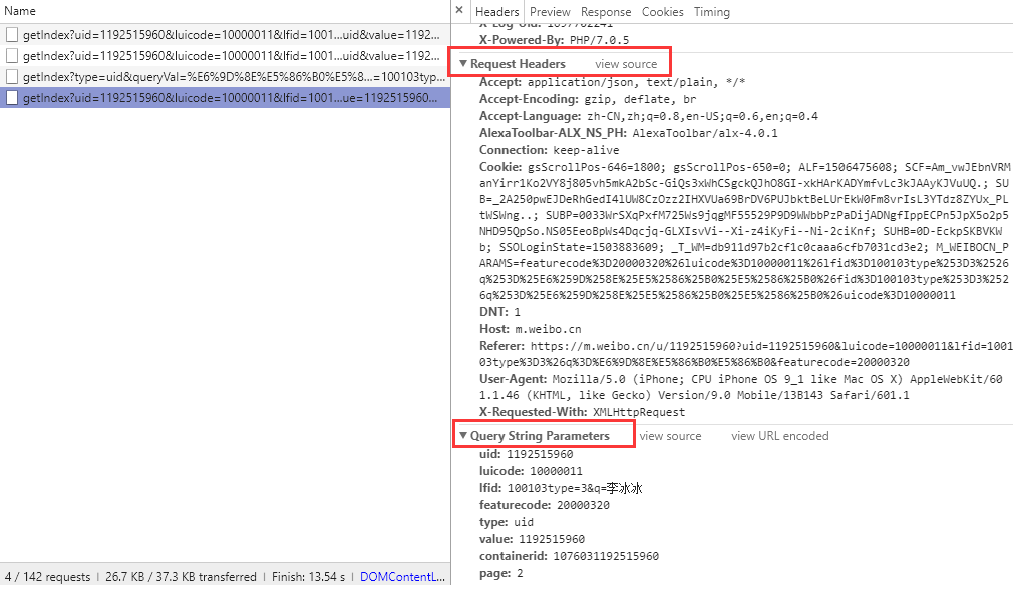 打开 Chrome 浏览器的调试功能,选择 Network 菜单,观察到获取微博数据的的接口是 https://m.weibo.cn/api/container/getIndex ,后面附带了一连串的参数,这里面有些参数是根据用户变化的,有些是固定的,先提取出来。