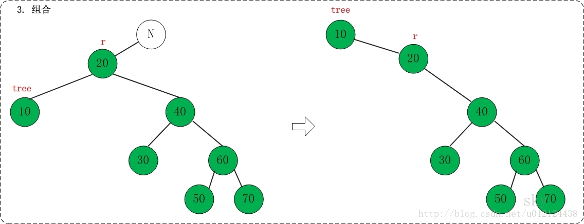 最后,找到节点或者遇到空节点之后,需要对左、中、右树进行合并。如图所示,将左树挂载到中树的最左下方(满足遍历顺序要求),将右树挂载到中树的最右下方(满足遍历顺序要求)。
