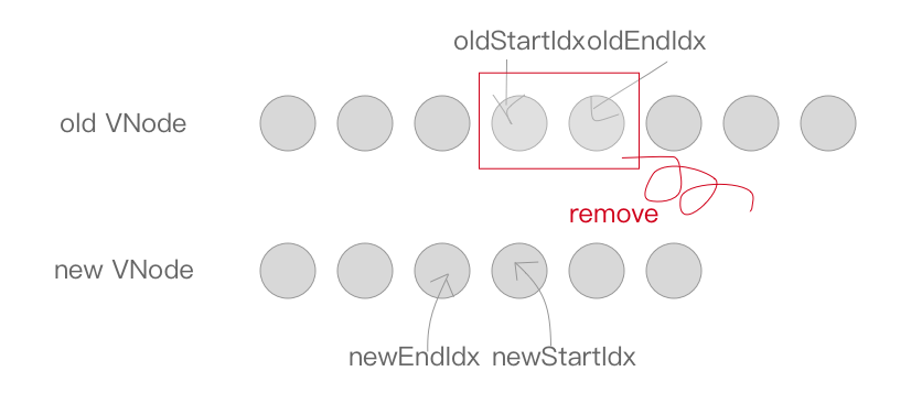 2。同理,当newStartIdx > newEndIdx时,新的VNode节点已经遍历完了,但是老的节点还有剩余,说明真实DOM节点多余了,需要从文档中删除,这时候调用removeVnodes将这些多余的真实DOM删除。