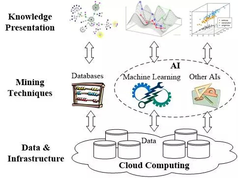 如图二所示, 数据挖掘是从数据中发掘知识的过程,在这个过程中人工智能和数据库技术可以作为挖掘工具,数据可以被看作是土壤,云平台可以看作是承载数据和挖掘算法的基础设施 。
