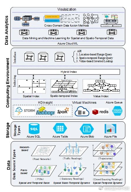 云计算平台本身为大数据的存储和分析提供了很好的基础设施(如storage和Hadoop、Spark和Storm等分布式计算环境),但默认的云平台上并没有自带强大的机器学习和人工智能能力,也缺乏高效的索引机制(如时空索引算法)。因此,云平台并不等于大数据平台。近期不少公司在积极地开发基于云平台的机器学习工具(如AzureML)和人工智能平台。图三是我们基于Azure搭建的城市大数据平台,其中时空索引、针对时空数据的机器学习算法和多源数据融合算法都是以前的云平台所不具备的。