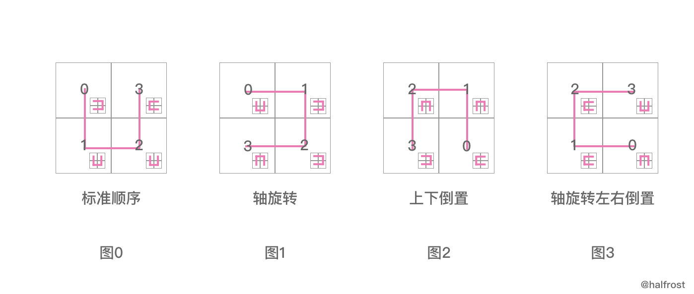 首先需要回顾一下希尔伯特曲线的生成方式,具体代码见笔者 上篇文章的分析 ,在这个分析中,有4个方向比较重要,接下来的分析需要,所以把这4个方向的图搬过来。