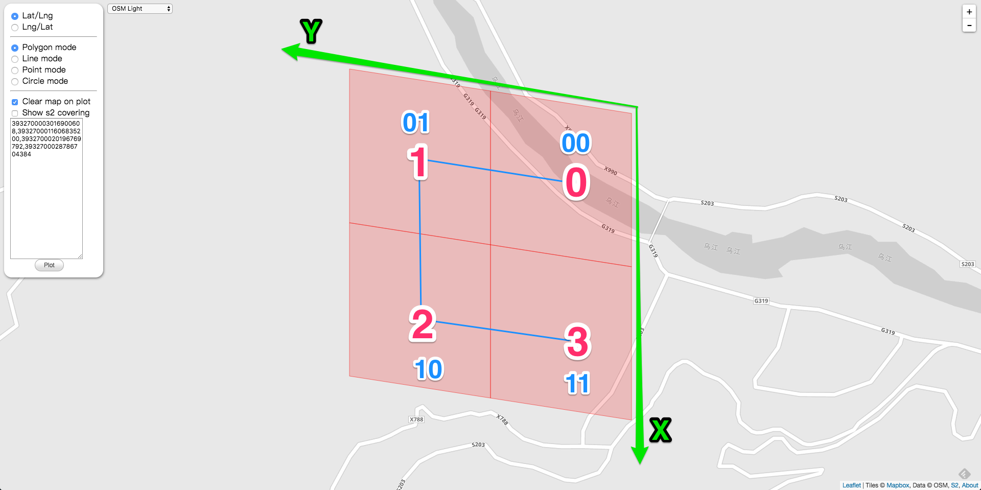 假设有上图这4个连在一起的 Cell。先根据经纬度把 CellID 计算出来。