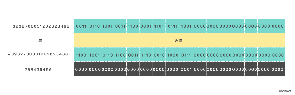 查找的过程就是利用的二分的思想。64位先查找高位32位,如果对高32位的掩码进行按位与运算以后结果不为0,那么就说明高32位是存在不相同的位数的,那么最终结果 msbPos 加上32位,并把数字右移32位。因为高32位存在不同的数,由于我们需要求最左边的,所以低32位就可以直接舍去了,直接右移去掉。
