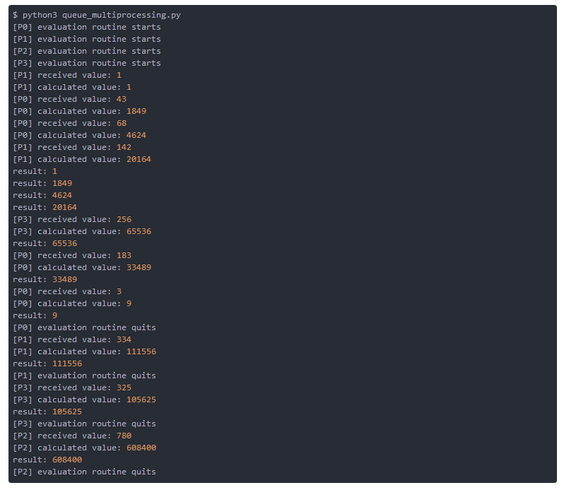在主循环中,我们从该队列读取,并计数-1。 一旦我们计算了我们有过程的终止确认数量,主循环就会退出。 否则,我们从队列中输出计算结果。