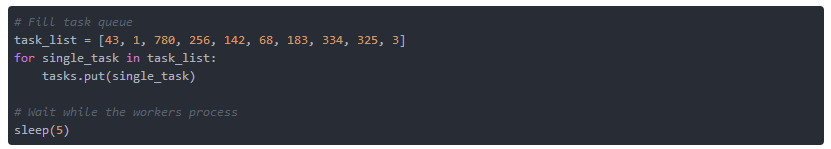 我们的工作进程正在等待工作。我们定义一个任务列表,在我们的例子中是任意选择的整数。这些值将使用 tasks.put() 添加到任务列表中。每个工作进程等待任务,并从任务列表中选择下一个可用任务。 这由队列本身处理(见 清单2.6 )。