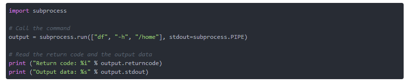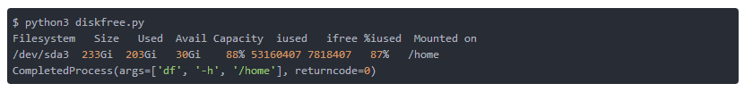 这是基本的调用,非常类似于在终端中执行的命令 df -h / home 。请注意,参数被分隔为列表而不是单个字符串。输出将与示例4相似。与此模块的官方Python文档相比,除了调用的返回值之外,它将调用结果输出到 stdout 。