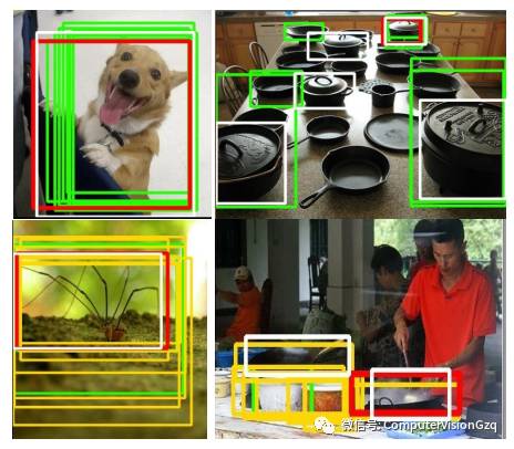 白框为标注窗口;红框为密集融合窗口;绿色框得分大于等于0.6;黄色框得分低于0.6大于0.3