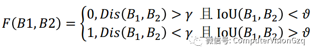 密集区域的判别函数通过计算两个窗口的中心点距离和窗口之间的IoU来确定。
