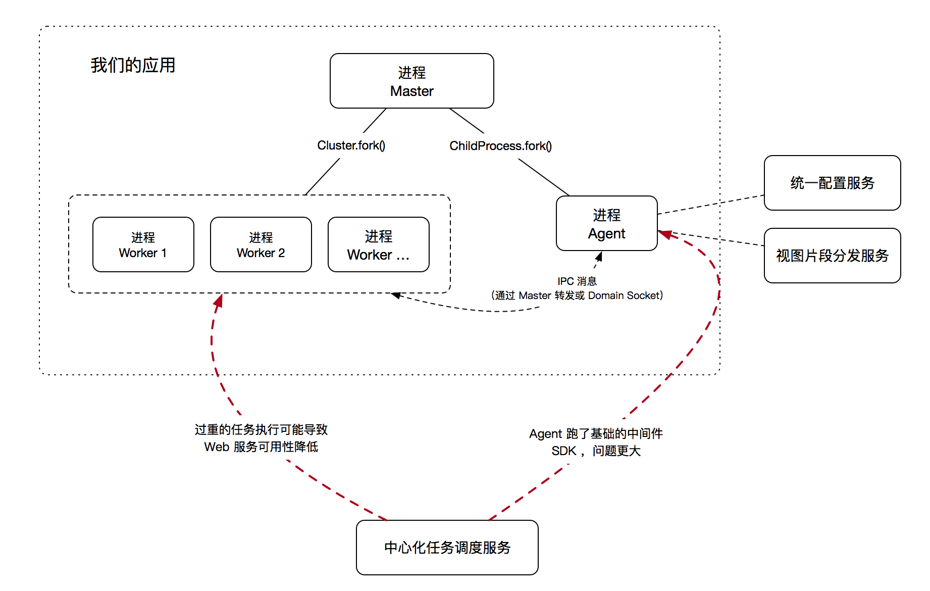 除了一些内存共享的通信场景, 也出现了 Worker 进程跑一些定时任务占用时间过长,导致 Web 接口超时等问题(或者系统容量降低)。更有甚者,把定时任务放到 Agent 中去执行,直接拖挂了基础的中间件服务,导致应用全盘崩溃。