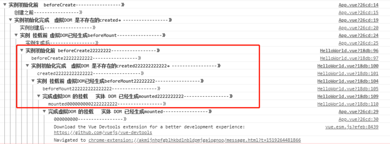 下图带222 的 是为子组件,所以一次顺序是为 先创建父组件,然后才穿件子组件,当子组件创建完成并且实体dom挂载完成后父组件才挂载完成