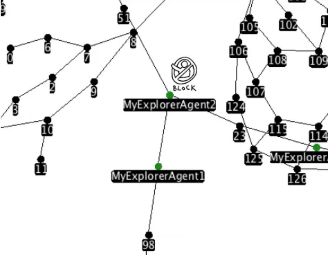 模拟中智能体的冲突:MyExplorerAgent2 挡住了其他两个智能体。