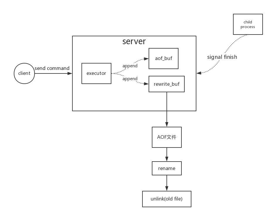 在子进程执行AOF重写时,服务端接收到客户端的命令之后,先执行客户端发来的命令,然后将执行后的写命令追加到AOF缓冲区中,同时将执行后的写命令追加到AOF重写缓冲区中。 等到子进程完成了重写工作后,会发一个完成的信号给服务器,服务器就将AOF重写缓冲区中的所有内容追加到AOF文件中,然后原子性地覆盖现有的AOF文件。