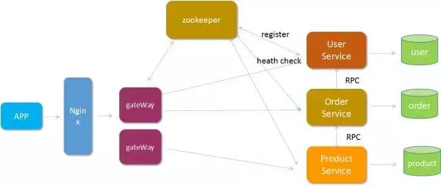 下图中的每个组件都是需要部署在单独的服务器上,gateway用来接受前端请求、聚合服务,并批量调用后台原子服务。每个service层和单独的DB交互。
