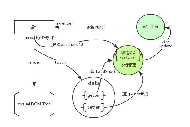 Vue支持我们通过 data 参数传递一个JavaScript对象做为组件数据,然后Vue将遍历此对象属性,使用 Object.defineProperty 方法 设置描述对象,通过存取器函数可以追踪该属性的变更,Vue创建了一层 Watcher 层,在组件渲染的过程中把属性记录为依赖,之后当依赖项的 setter 被调用时,会通知 Watcher 重新计算,从而使它关联的组件得以更新,如下图: