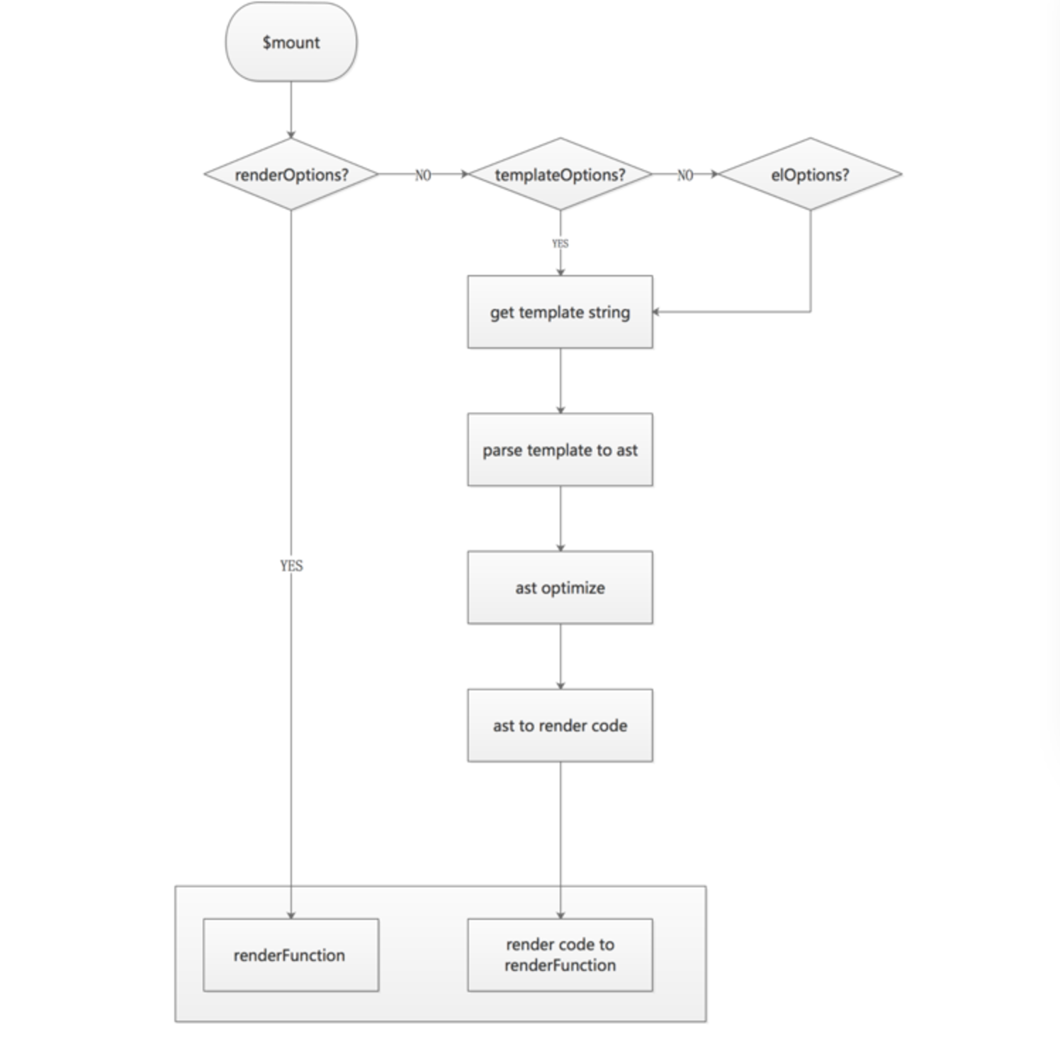 运行时构建的包,会比独立构建少一个模板编译器。在 $mount 函数上也不同。而 $mount 方法又是整个渲染过程的起始点。用一张流程图来说明: