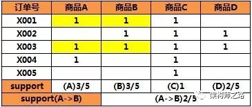 共5笔订单,2笔同时包含AB,即A->B的支持度是2/5。