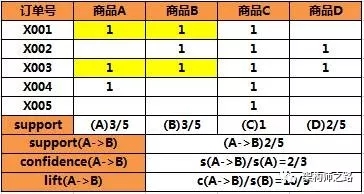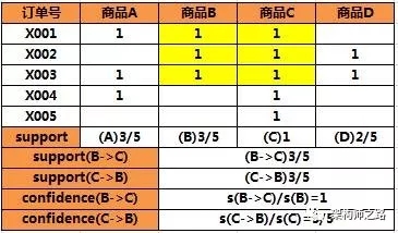 答:共5笔订单,3笔包含商品A,A的支持度是3/5。