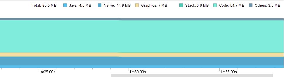 现在安卓APP大多都用到了WebView+H5混合开发,在Android中的WebView存在很大的兼容性问题,不仅仅是Android系统版本的不同对WebView产生很大的差异,另外不同的厂商出货的ROM里面WebView也存在着很大的差异。即使WebView不加载任何内容,它本身也会占用很大的内存,在此基础上启动多个WebView占用的内存不会有太多变化,WebView的渲染类似一个单例模式View,但又不同于原生View,因为WebView在页面销毁之后内存仍然不会有明确减少。如下是两张截图,第一张是在Activity之上启动一个使用WebView的Activity,可以看出内存有明显的涨幅,第二张是关闭已经开启的WebView的Activity,内存虽有部分减少,但是跟没有加载WebView时相比微乎其微。