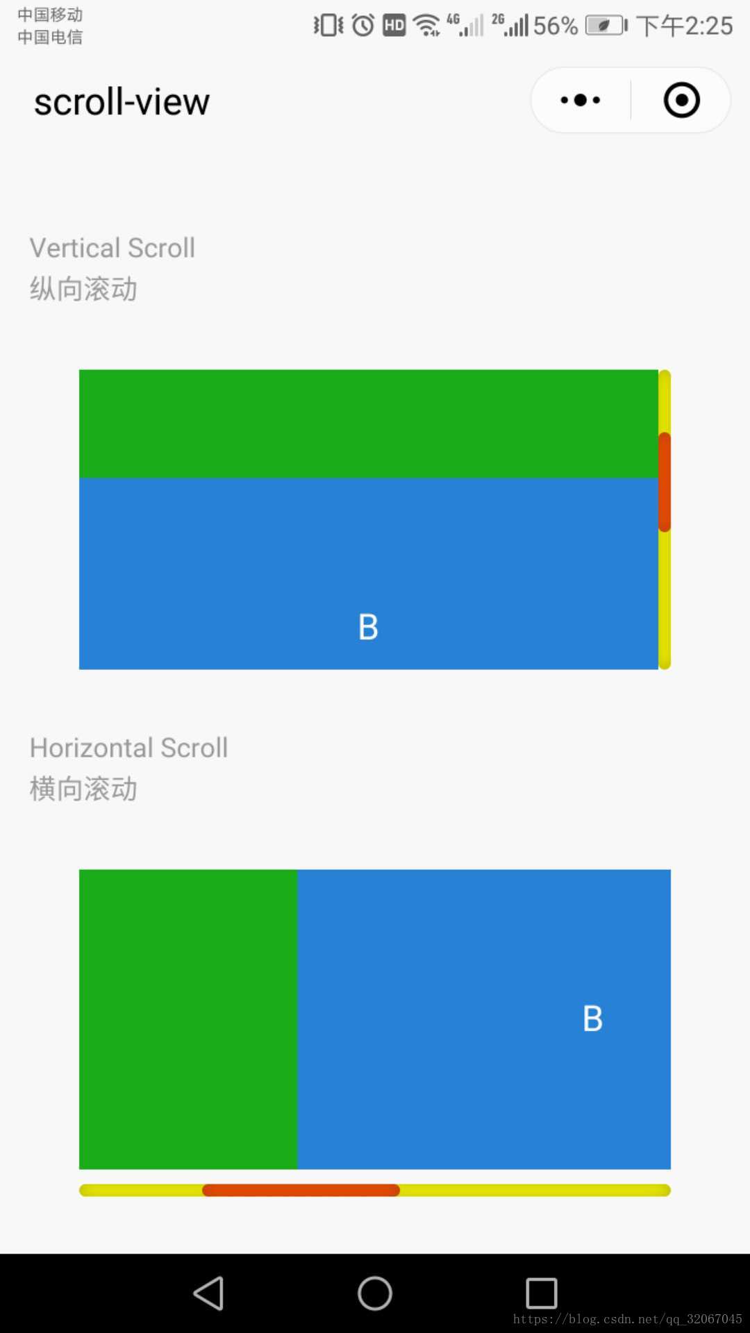 小程序的scroll-view用的比较多了,列表页一般也没管它的滚动条,最近突然发现在android与ios中横向滑动的时候表现不一样。不一样在哪呢,ios上直接就不显示啊,也是没谁了。深入想了一下,这滚动条能不能换一颜色或者换个样式。有这冲动就立马着手改。