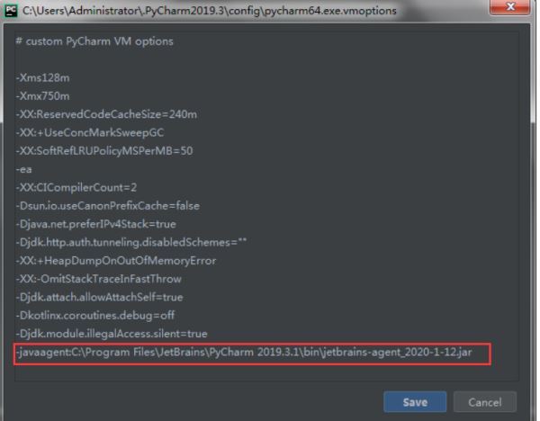 在打开的编辑窗口末行添加(补丁文件的绝对路径):-javaagent:你pycharm的安装目录\bin\补丁文件名