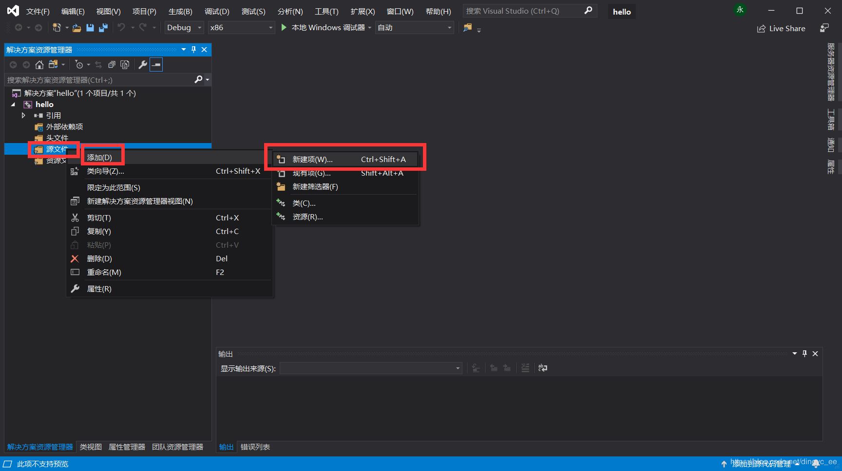 在左侧的解决方案目录下,选中源文件,右键单击,选择添加->新建项,如下图所示
