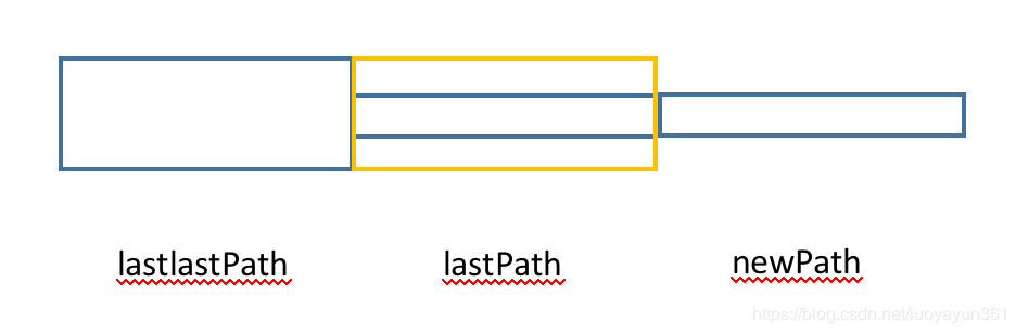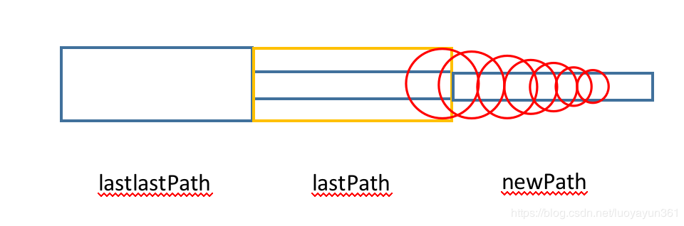 从上面的图示可以看到,我们将最新的newPath绘制细线,那么如果这时候又出现一个新的点,形成了新的path,而之前的newPath就会变成前一个path,这里命名为lastPath,由于该path还是细线,所以这里我们需要将前一个path重新补充绘制成正常的粗线,图示如下: