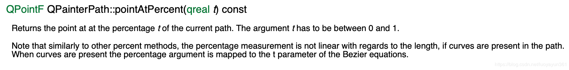 其实Qt已经提供了接口,我们通过QPainterPath来生成的曲线,这个类提供了一个函数叫pointAtPercent,定义如下:
