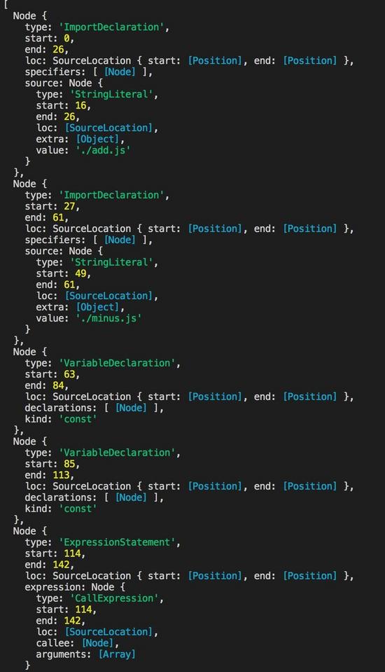 我们可以看到,入口文件 index.js 的所有内容都以字符串形式输出了,我们接下来可以用正则表达式或者其它一些方法,从中提取到 import 以及 export 的内容以及相应的路径文件名,来对入口文件内容进行分析,获取有用的信息。但是如果 import 和 export 的内容非常多,这会是一个很麻烦的过程,这里我们借助 babel