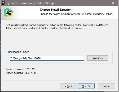 点击 Next> , 于 Destination Folder 安装目录选择:D:\Dev\tool\PyCharm2020 (自定义)。点击下一步