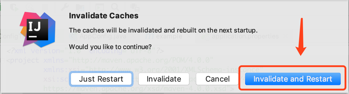 选择下面的Invalidate and Restart即可清空IDEA的缓存,并且重启;注意,下一次重启后,需要比较长的时间来重新构建索引,所以可以找一个空闲时间进行。