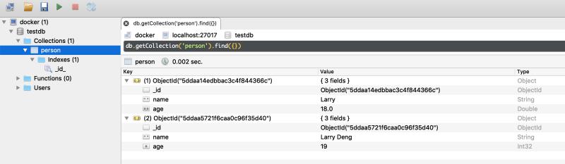 { "_id" : ObjectId("5ddaa14edbbac3c4f844366c"), "name" : "Larry", "age" : 18 }
