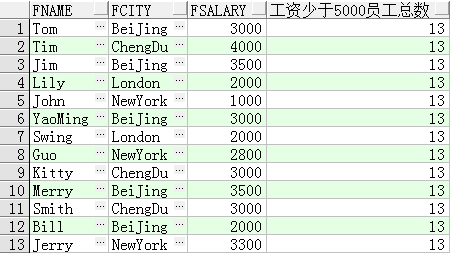 select fname, fcity, fsalary, (select count(*) from t_person where fsalary < 5000) 工资少于5000员工总数 from t_person where fsalary < 5000