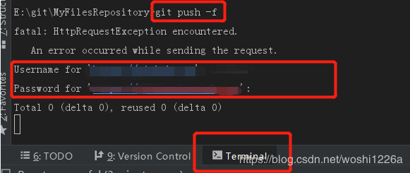 后,提示Push拒绝。打开Terminal,在本项目目录下,输入git push -f 强制同步远程仓库。