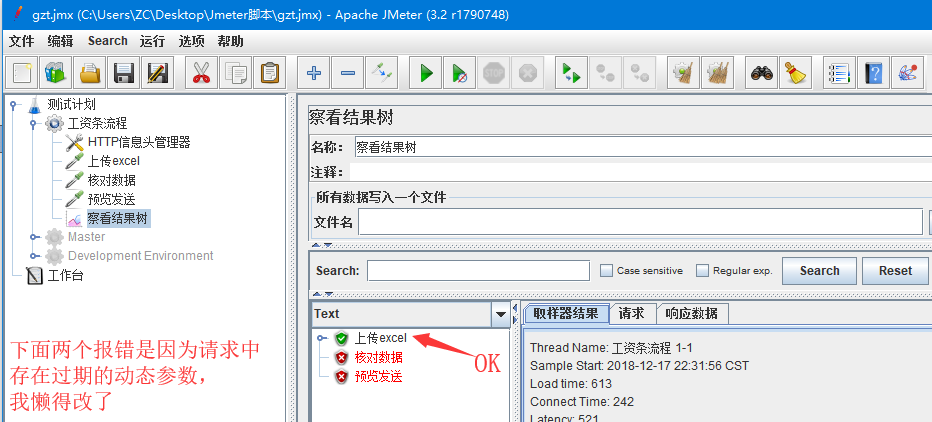 运行一下看一下结果树的反馈(下面两个报错可以忽略,与本主题无关,纯粹是懒所以没改)。