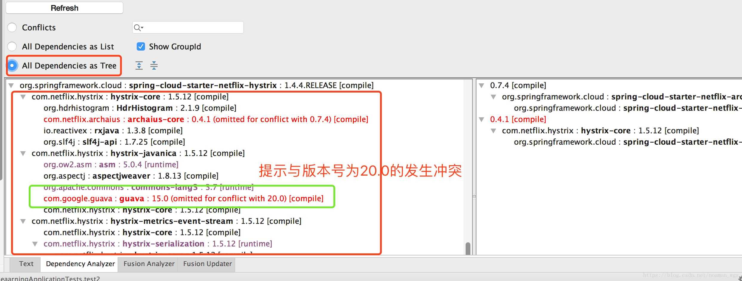 我们之前导入了Guava的原生jar包,版本号是20.0;而现在提示Guava产生冲突,且冲突发生位置是Hystrix所在的jar包,所以可以猜测Hystrix中包含了对Guava不同版本的jar包的引用。