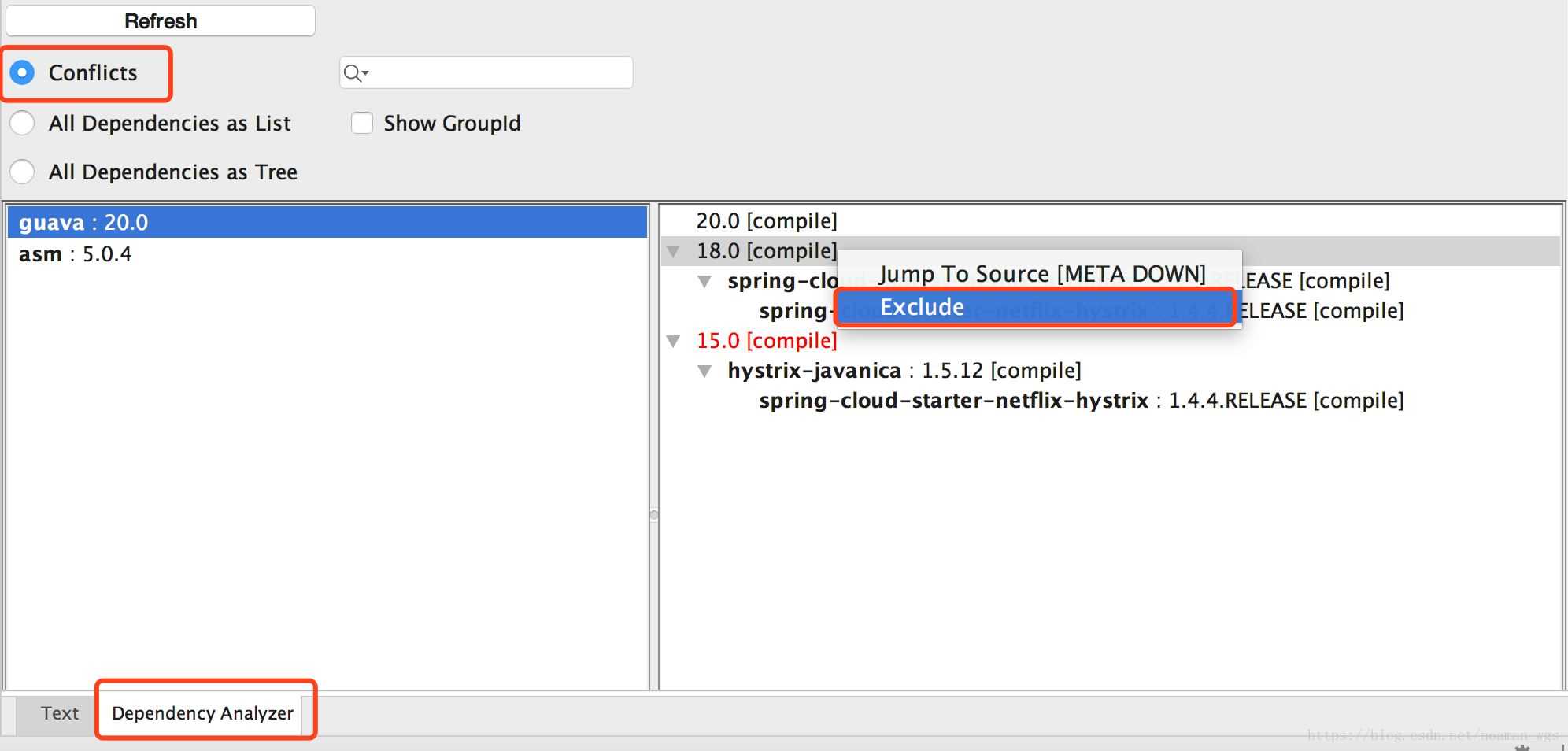 (1)我们可以借助Maven Helper插件中的Dependency Analyzer分析冲突的jar包,然后在对应标红版本的jar包上面点击execlude,就可以将该jar包排除出去。