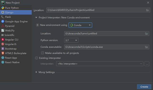 能直接在新建项目的时候选择Django并新建一个独立的虚拟环境: