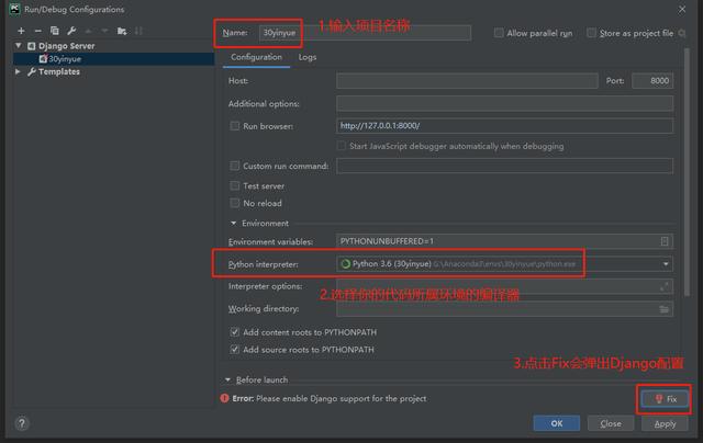 进来后先输入Name 项目名称,然后在Python Interpreter选择你的代码所属环境的编译器,最后选择Fix,弹出Django配置页。
