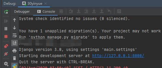 点击后会自动生成启动Django的命令,你可以在console里查看该语句,出现以下的输出即启动完成: