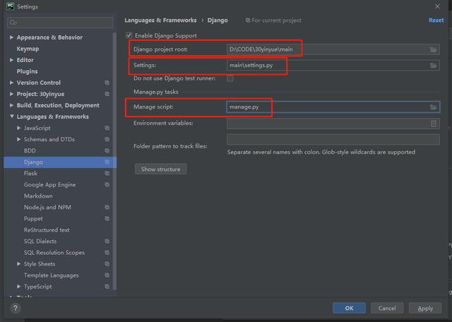 第一个是项目根目录,第二个是settings.py文件的位置,第三个是manage.py的位置。三者缺一不可。搞定后点击OK,配置完成。